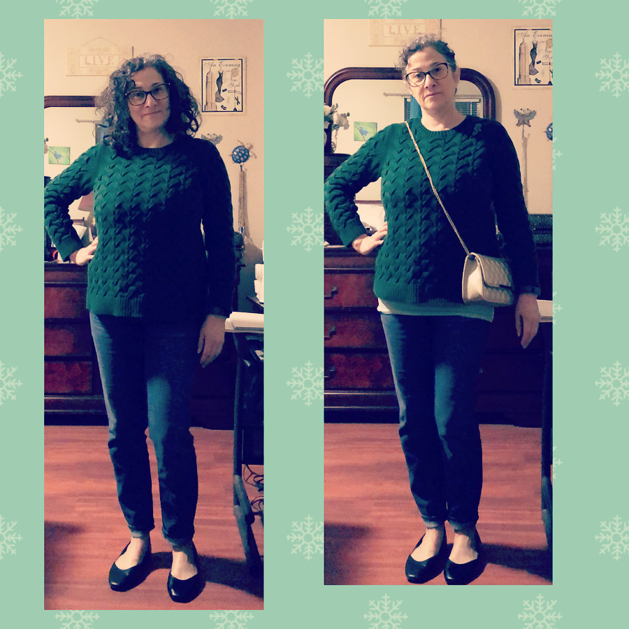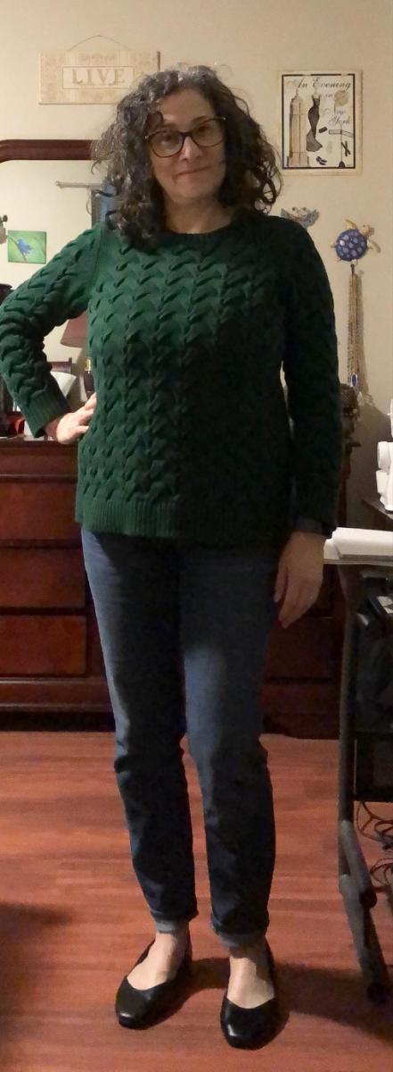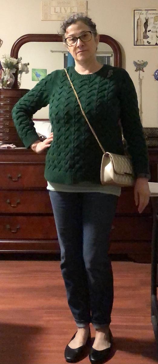 Here is the cable sweater with basic skinny jeans (Old Navy) and flats (Lucky Brand). Notice that my hair is down, which adds bulk.