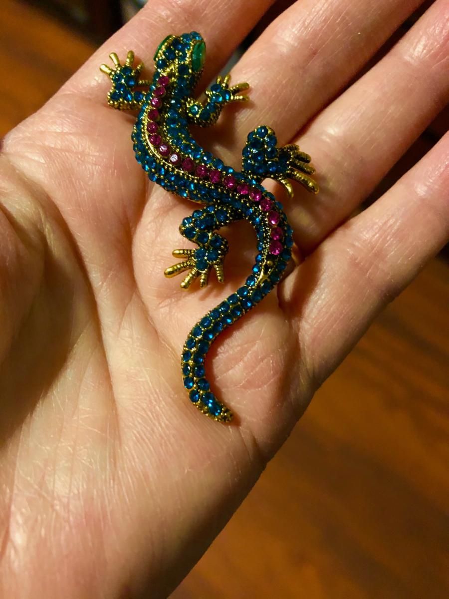 You may notice something on my shoulder. I'm wearing a sparkly gecko brooch, and here is a closeup. A brooch is a great way to draw attention away from trouble spots. This one was a gift from my husband. He gave me another one 30 or so years ago, so this was an anniversary gecko.