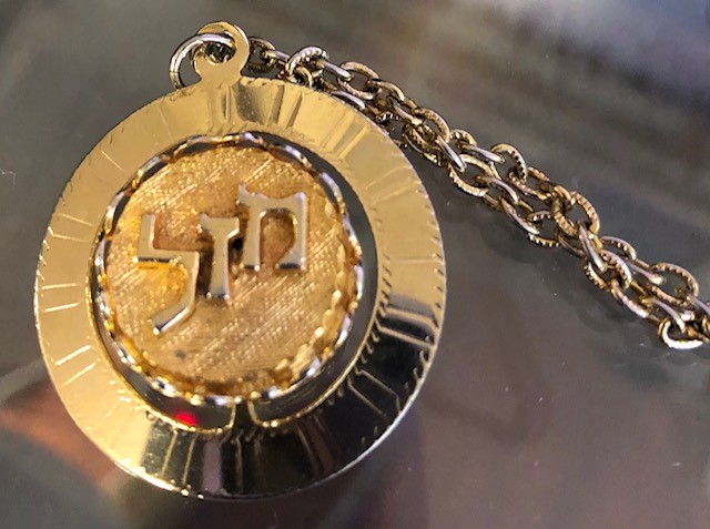 My necklace was purchased at a thrift shop in St. Louis many years ago, and remains one of my favorite pieces.  It says, in Hebrew lettering, MAZEL (luck) on one side, and CHAI (life) on the other.