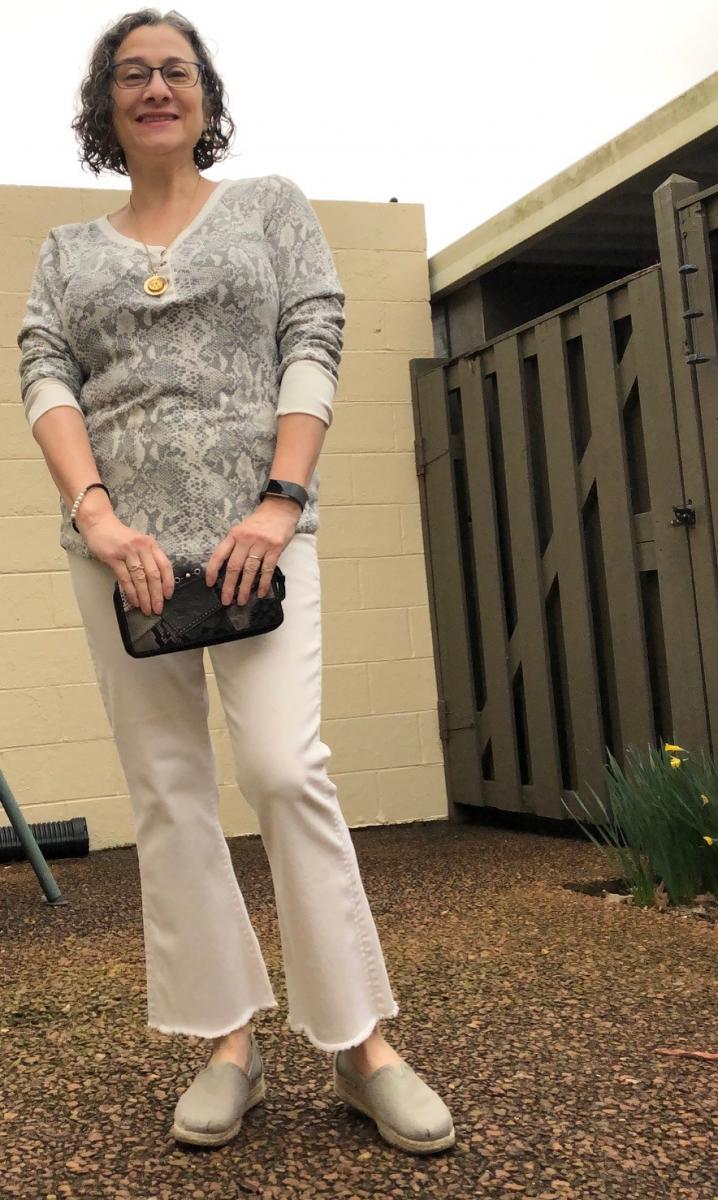 I got these jeans as a gently used gift from my dear sister.  They are Ann Taylor, and as she is one of their most successful sales associates, she gets a huge discount, but they didn't work as well for her as she had hoped, so I got lucky!  I love these cropped flares.  The cream color is barely different from the trim on my shirt.